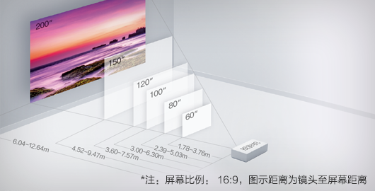 灵活投影尺寸,画面多大,由你掌控!大范围焦距及高倍广角镜头,灵活应对多种画面尺寸及投影距离,推荐使用在大于或等于20㎡且满足投影距离的环境中,详细投影距离请下载产品官方彩页。狭小空间亦能轻松享受大画面的乐趣!