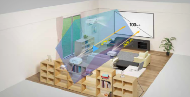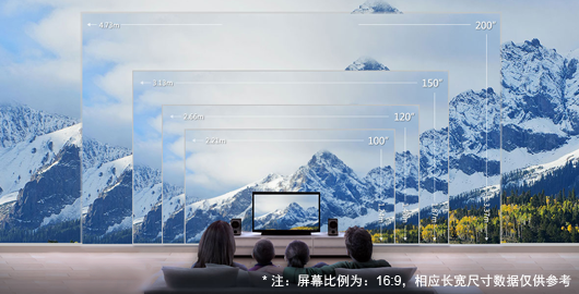 灵活投影尺寸,画面多大,由你掌控!大范围焦距及高倍广角镜头,灵活应对多种画面尺寸及投影距离,推荐使用在大于或等于20㎡且满足投影距离的环境中,详细投影距离请下载产品官方彩页。狭小空间亦能轻松享受大画面的乐趣!