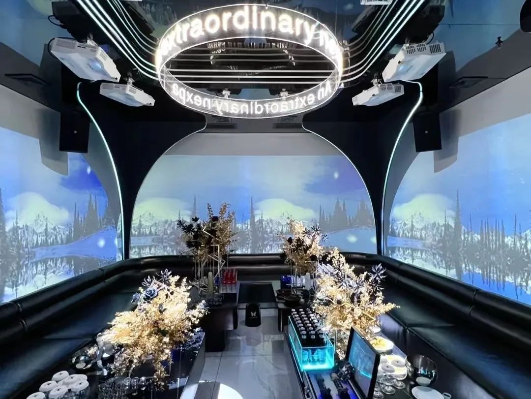 沉浸式KTV将数字技术、三维技术和人机交互技术的结合。它通过虚拟场景仿真显示技术、边缘融合技术和多媒体交互技术,将高清图像完美融合,形成一个多彩的光影室。它可以模拟大部分可以想到的场景,并很好地呈现出来,这样消费者就可以从视觉和听觉上获得全方位的沉浸式体验,搭配现场灯光、音乐打造超强光感体验。