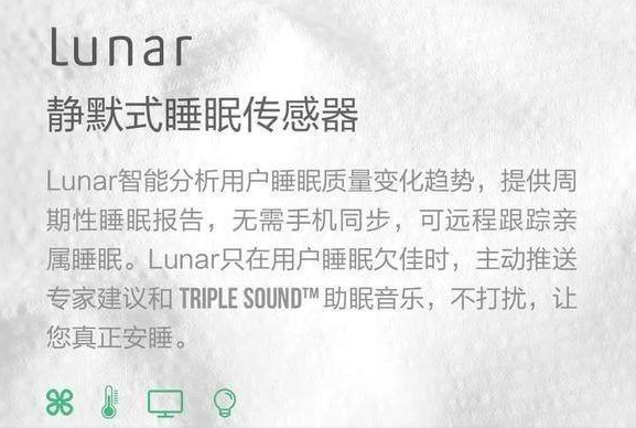Lunar能够智能分析用户睡眠质量,提供周期性睡眠报告,可远程跟踪亲人睡眠。在用户睡眠欠佳时,能够主动推送专家建议和Triple sound助眠音乐,不打扰,让你真正安睡。
