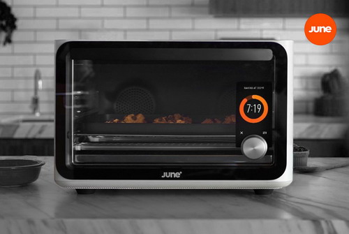 June智能烤箱可谓是目前传感器最多的智能厨电设备。在烹饪时,用户只需将食材放入烤箱,摄像头和称重计会自动识别食材和要制作菜肴的种类和重量,计算机会自动设定合适的温度和烹饪时间。烤箱内置的温度计探针,可插入肉等食材中测量内部温度,一边测量肉内部的温度一边调整火候,所以能够防止不熟或烤焦,还能烤到用户所喜欢的口味。最重要的还是摄像头识别系统,拥有用来识别食材的HD内置摄像头,可以自动识别几十种食材。