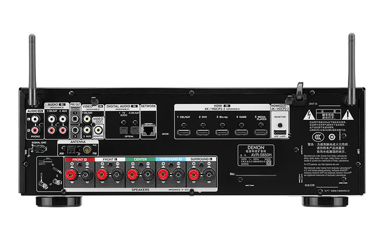 附带的AVR-S650H快速入门指南提供如何开始使用的简单、清晰说明。一旦通过HDMI将电视连接到AVR-S650H,您的电视屏幕上就会出现专属的Denon设置助手,一步一步地指导您完成整个设置。AVR-S650H按照HDMI信息自动重命名输入源,快速选择为所有区域提供一键式按钮。带颜色编码的扬声器接口水平排布,便于整理和连接扬声器线路。