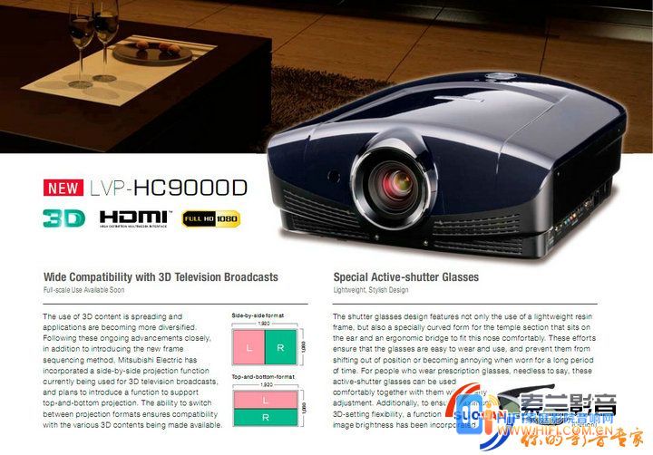 三菱hc9000也采用了SXRD显示芯片组,具备240Hz的驱动,使用主动快门式的3D显示方式,将在2011年1月上市,欢迎订购。