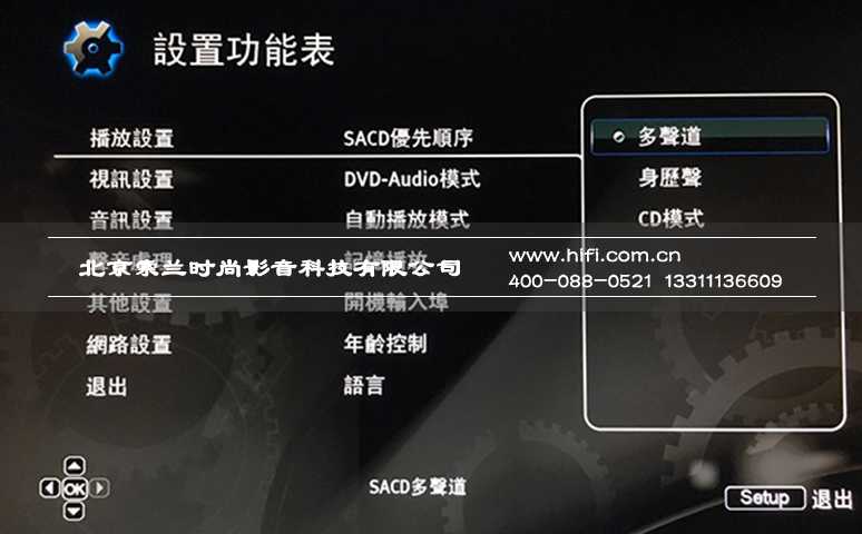 在播放SACD前,须先在本蓝光播放机选单中决定播放那一层∶多声道为SACD多声道层;声历声为SACD立体声层;CD模式则为CD层。