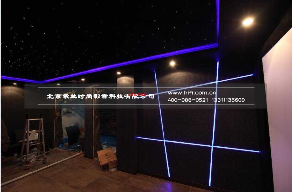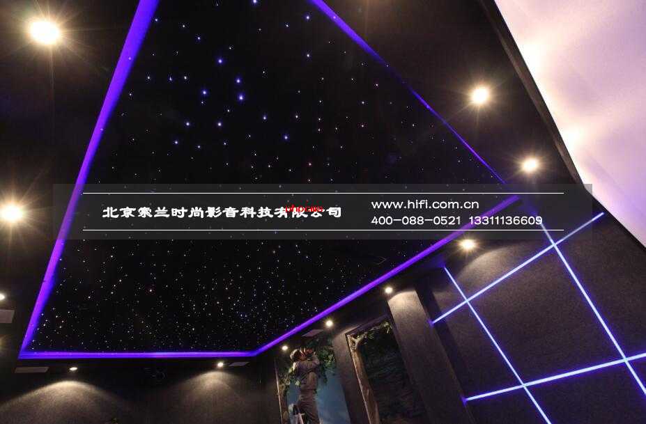 后墙的以扩散为主,以增加观影区的声场包围感,表面使用专业透声布进行装饰,形成隐藏式声学处理结构,即不影响声学效果又达到视觉的美观。顶面的处理考虑到房间内的中高频反射现象,采用了经典的星空顶设计,即点缀了影音室内的浪漫氛围,又能起到吸收中高频反射的作用。