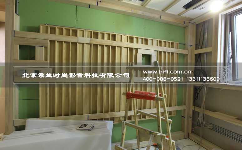 本案所处为精装修复式户型,房间不属于原始毛坯结构,所有墙面都已完成装饰工程,家庭影院装修施工则要在这样的环境中完成。由于是私人地下室家庭影院,房间所处位置较为独立,三面为实体墙结构,具有良好的自然隔音性,而入室门一侧为泡沫隔墙,又紧邻另一个房间,隔音性较差,因此在家庭影院装修施工初期先要对这面墙体进行加固和隔音处理,选用石膏板、隔音毡、吸音棉等材料在墙面构建隔音层,同时将原有入室门换掉,改用定制的声盾隔音门以增加房间的隔音性。由于墙体结构原因,为保证隔音门能顺利安装,必需对门洞也进行加固处理。