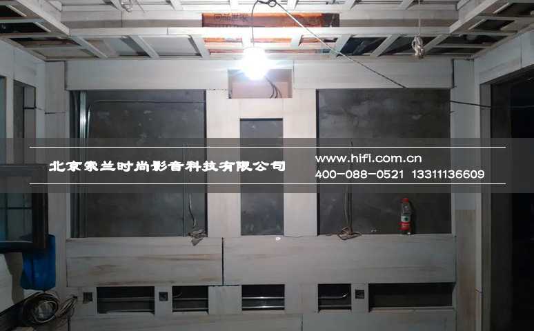 梯形结构的区域由于结构不规则,做为透声结构的幕布墙却是非常合适,从开始变窄的位置打造龙骨结构,透声空腔净深将近1米,放置落地式家庭影院音响空间足够。