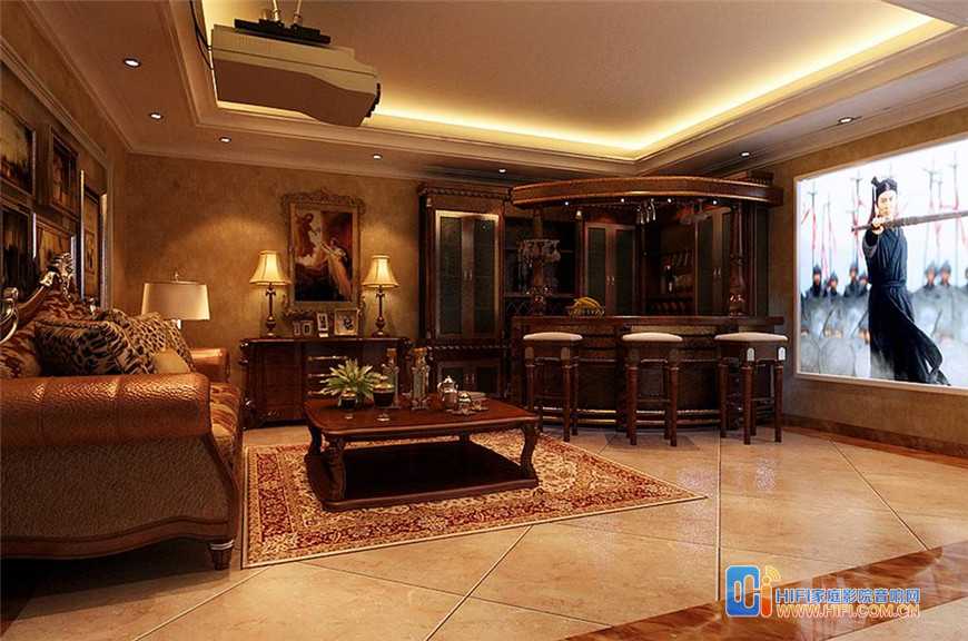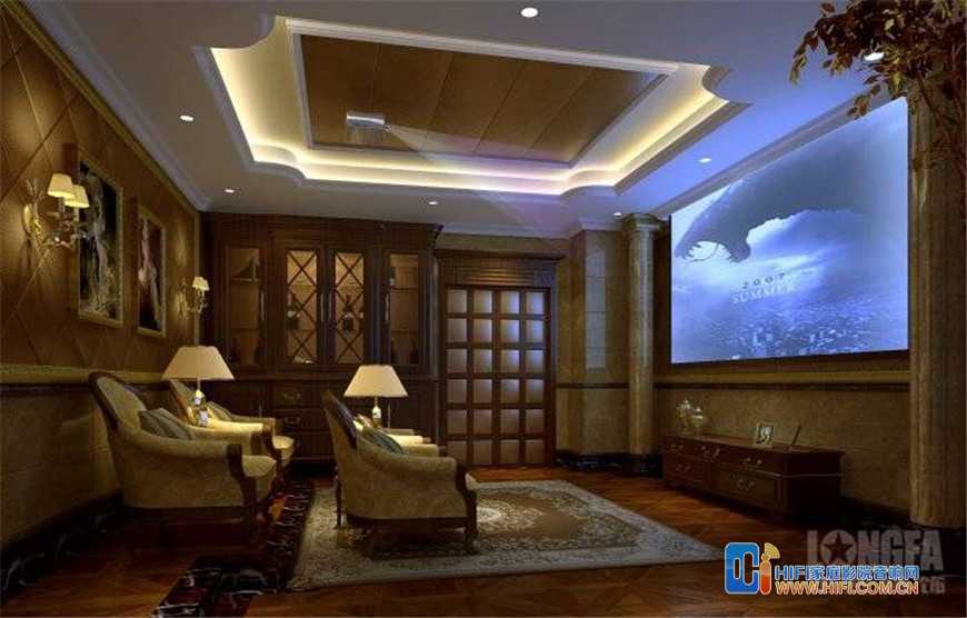 可以看出,古典设计风格以欧式古典风格为主,整个设计空间弥漫着奢华与浪漫的气氛。明快的色彩、硬朗的材质和雅致的配饰,赋予了空间明亮的神采。古典风格装修的家庭影院一方面将怀旧的浪漫情怀与影音、视听需求相结合,另一方面又兼顾了华贵和典雅,反映出后工业时代装修个性化及人性化的特点。