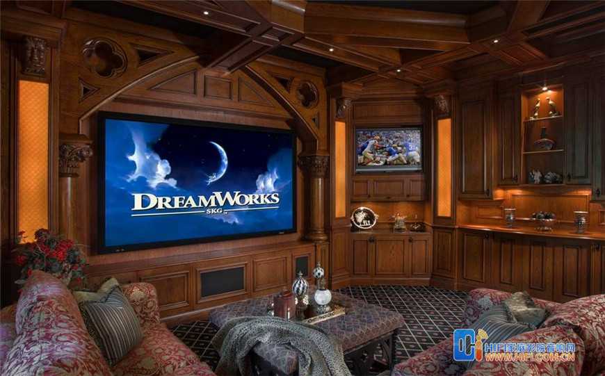 从上面的图片中可以看出来,古典风格强调奢华。但是在具体的家庭影院装修中,也体现着一种和谐美。它强调装饰效果,往往用许多陈设品来加强室内的环境氛围。但也兼顾了家庭影院中功能性的需求。