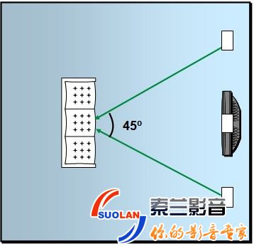 左前置和右前置对着聆听位置形成45度夹角;如果内扣就靠拢小屏幕 不要贴附在小屏幕的边上。