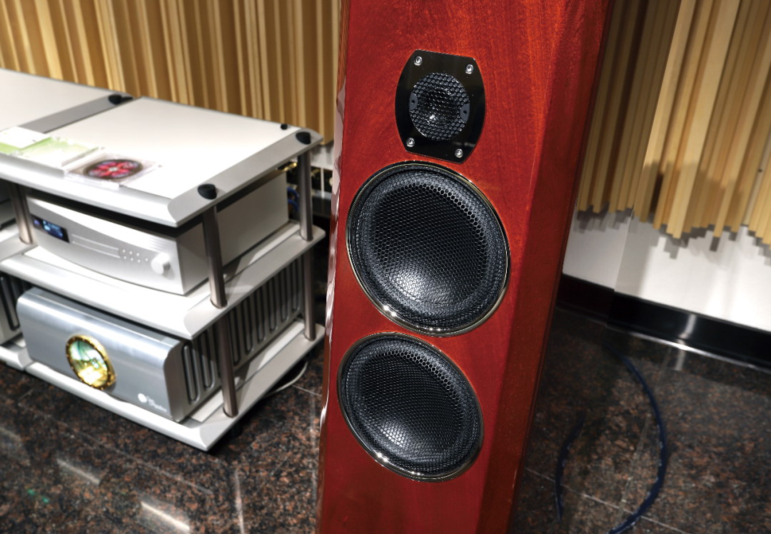 低音单元和中低音单元则是采用了厂家独有的BCC振膜,由非常轻但不变形的陶瓷材料制成,振膜呈深黑色,采用了3D蜂巢三明治结构振膜,既坚固又轻盈。同时,这两只单元采用长冲程双腔体设计,配合专门量身打造的单元盆架、音圈、磁体实现最佳的音质表现。另外,单元盆架外圈的超大不锈钢圆环由手工抛光而成,可以避免声波在保护网罩上产生不必要的反射。