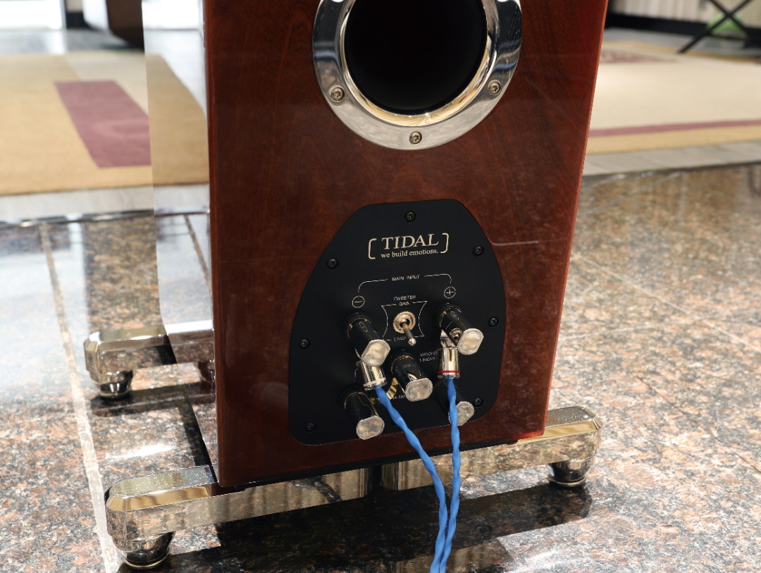 在Piano座地式扬声器的背板下方,是一只不锈钢外圈的低频导向孔和一组上二下三共五只接线柱。为什么接线柱是五只呢?这就是TIDAL品牌的独特之处了——可以通过不同的接线方式匹配不同大小的听音空间,厂家称之为Vario(可变)接线柱。因此,Piano座地式扬声器有三种接线方式:纯双声道(针对非常小的空间)、线性2.5路分频(针对中等大小空间)、增益2.5路分频(针对较大空间,或在中等大小空间中实现更丰富的低频)。这三种接线方式都是配合分频器对高音单元的滤波曲线作相应的调整,使得扬声器的空间适应能力大大增强。所有TIDAL品牌扬声器均采用了经过深冷处理和复杂加工的纯银材料作为接线柱的导体,保证最低的电阻,让输入的音乐讯号不会发生任何损失或改变。绝缘部分则使用了结构复杂的纤维增强聚合物材料,以避免产生任何感应电磁场并锁紧线材。