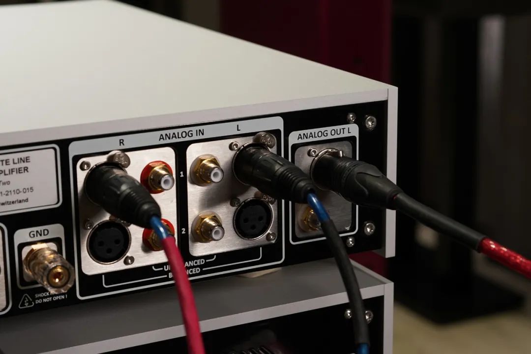 机器后面两侧是XLR平衡与RCA讯号输出,各一组,下面中间电源插座,左手边是电源总开关,右边是接地接线柱,2组XLR平衡2组RCA讯号输入,通过前面板2个小按钮进行切换。