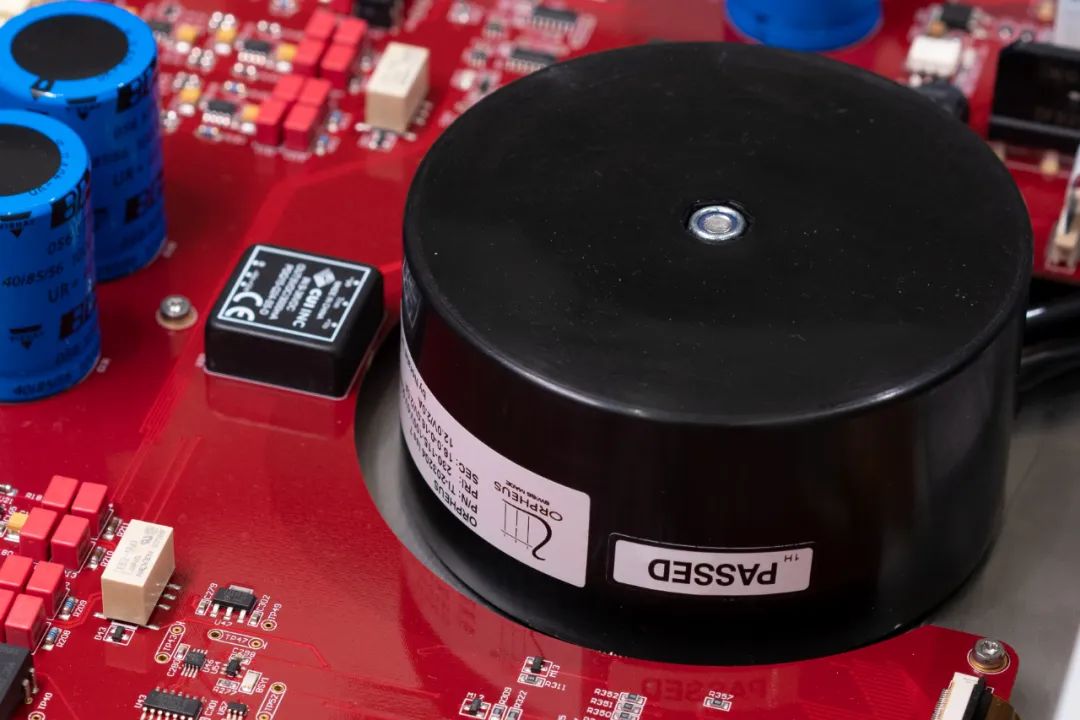 打开天琴D22前级顶盖,眼前呈现出整洁零件排列,看了都赏心悦目,一个安置在中间靠前位置金属圆桶,里面是天琴自家变压器,外面贴有PASSED通过标志。金属圆桶装变压器工作时产生电磁干扰屏蔽起来,杜绝干扰到前级。变压器有3组电压输出,分别是2组16伏1组12伏,2组16伏分别为前级左右声道供电,12伏则为控制电路供电,双单声道设计,独立供电,使声音分离度,立体感,信噪比更好!