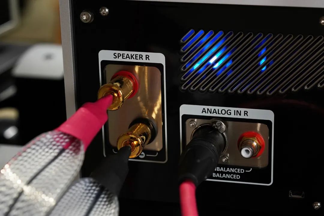 机器后面左右两侧是音箱接线柱,使用徳国WBT产品。1组XLR平衡1组RCA单端讯号输入,中间最下面是电源输入插座,左手边电源总开关,右手边与音箱接线柱一样东西,是机械接地,玩地合烧友也可以直接接这里。