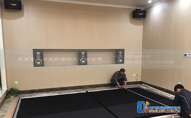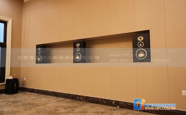 前墙配合JBL极品4号前置音箱,采用透声结构,音箱隐藏在幕布后,为了方便音箱摆位安装及考虑后期升级,特别为前置音箱设计了一个摆放台。