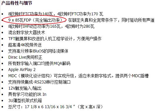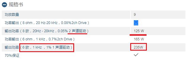 很多人是不注意后面的小括号的,当然外行也不懂啥意思,说白了,就是这个功率是只接一个声道(一共可是有11个声道啊),在6欧姆情况下(阻抗越大功率越小),只发出1kHz声音(正常使用时频率可是从20-20kHz实时变化),失真1%(一般低于5%的失真人耳无法分辨)的情况下测得的。