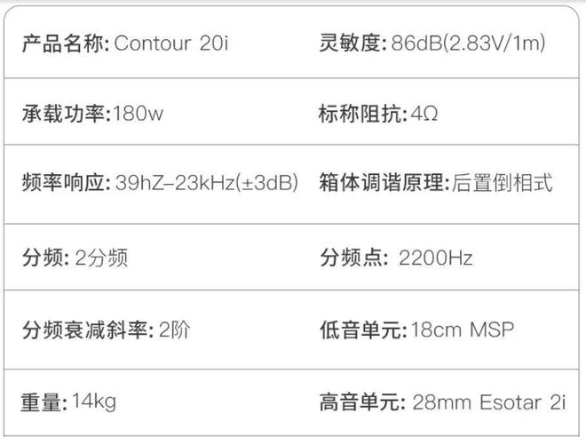 下图是丹拿顶级的书架音箱,售价约4-5万的Contour20i,采用7寸低音单元,低音下潜至39Hz-3db。这已经是7寸书架的极限了。