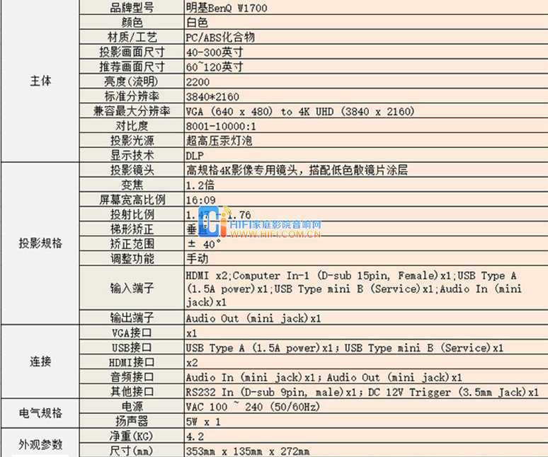 以上为明基官方所公布的W1700的基本参数,从数据中可以看出,虽然明基W1700在价格上突破了历史性低价,但是在各方面的性能中并没有打折扣,依然具备了家用投影机产品所必备的2000+流明的亮度。同时,W1700还具备了垂直40°的梯形校正功能,能适应更多的应用环境与安装方式。