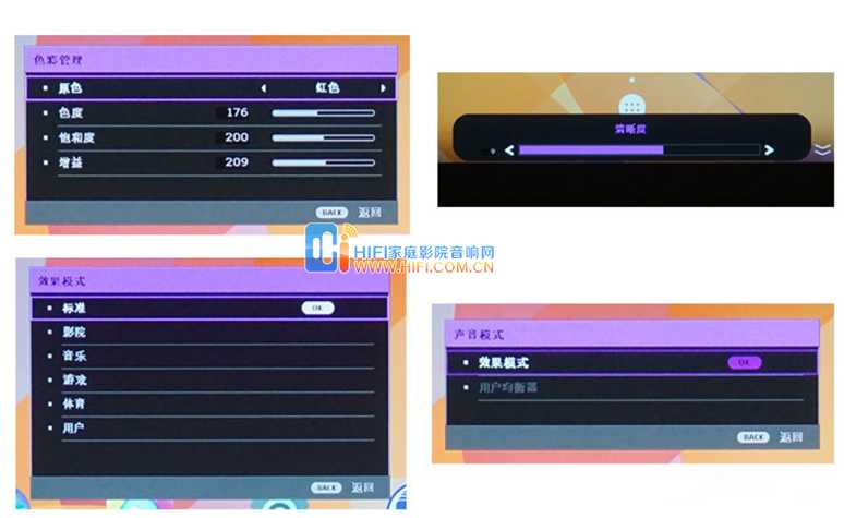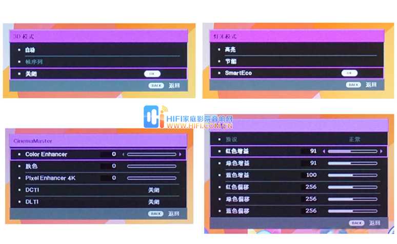 作为一款万元级以内的轻4K家用投影机,明基W1700在功能菜单方面同样具备了四五万元级以上的专业级家庭投影机所具备的功能,如色彩调节菜单、色彩偏好设置菜单、亮度、饱和度等功能菜单。