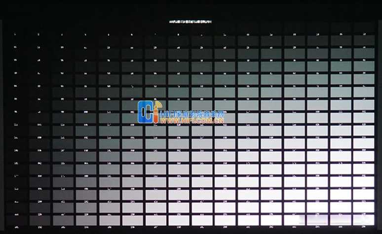 上图为明基W1700的256位灰阶测试实拍图,100寸投影画面,3.5米观看距离,画面中256位灰阶除横向1排的1~3位,竖向1列的1~2位无法明显区分之外,其他色块基本都能区分开来。