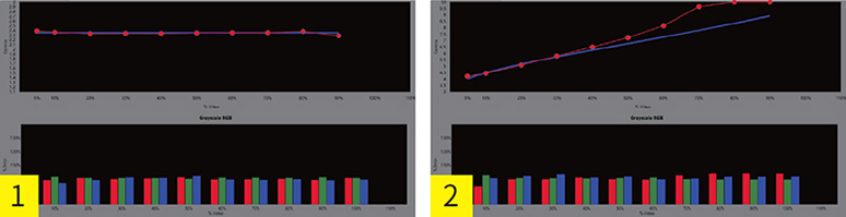 图1:在SDR(非HDR)状态下测试并调校画面的Gamma与灰阶白平衡,由最后的测试结果可以看到Gamma数值在整段灰阶状态下由始至终都能维持在2.35的推荐标准,而白平衡方面的表现同样十分出色,并没有明显的误差