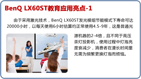 BenQ LX60ST/LW61ST的发光核心部件为激光二极管,灯泡模组寿命达到了10000/20000小时(普通/节能模式),以每天使用6小时时间算约合正常使用4.5-9年,是普通光源的2-4倍。