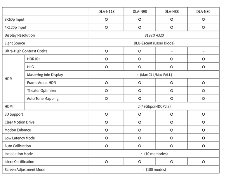 今天推出的全新一代8K混合激光家用投影机DLA-N118、DLA-N98、DLA-N88和DLA-N80,扩充了次世代D-ILA阵容。4款激光机型拥有次世代8K/60p和4K/120p输入,搭载高亮度和长寿命的混合激光系统,兼容HDR10+内容。