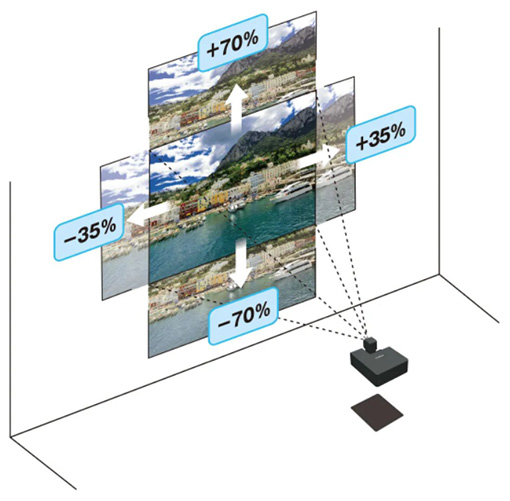 ・ 使用大口径非球面镜片,提供同类领先的Lens-Shift功能*3高达70%垂直和35%水平。该功能可以轻松移动投影画面的位置无需更改投影机的安装位置或方向。此外,其1.1倍光学变焦能力可以在安装过程中调整投影图像的大小。光学变焦功能与镜头移位功能相结合,可以实现更加高效和便利的图像调整。