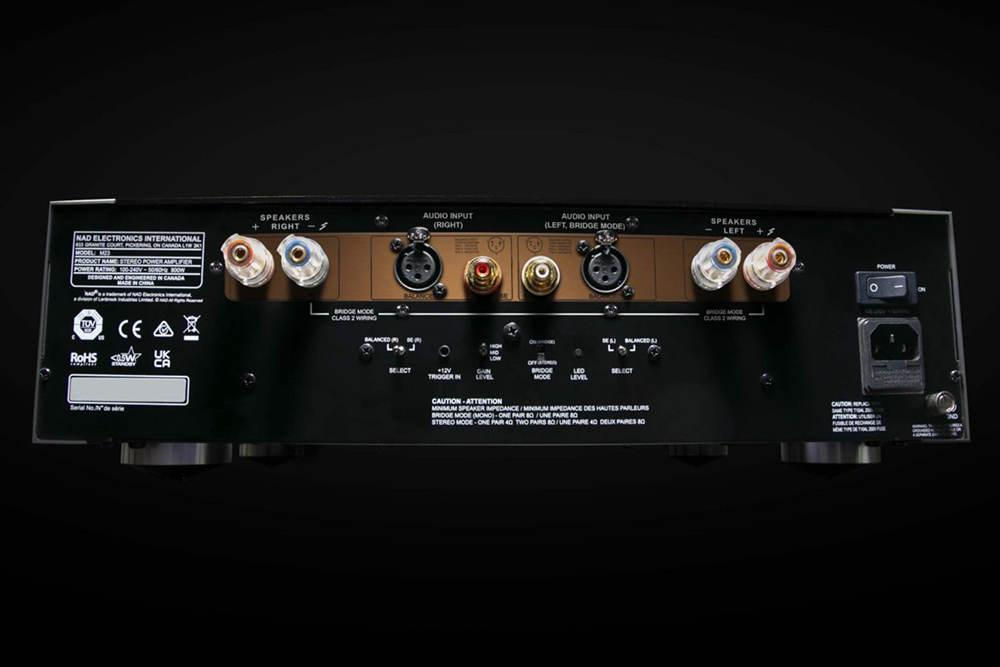 M23 配备性能卓越的 Purifi Eigentakt 放大模块,结合 NAD 自行设计的交换式电源,能在 8 欧姆负载下轻易输出 200 瓦功率,4 欧姆时甚至可达 380 瓦,配合 高于 800 的阻尼因子,可轻易驾驭市面上绝大多数难搞的音箱。不仅如此,立体声的 M23 还能桥接成单声道输出,此时连续功率上看 700 瓦 / 8 欧姆,可说是无坚不摧。