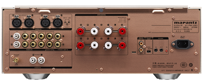 这里即便是扬声器端子也很特别:虽然最具雄心的竞争对手都倾向于使用第三方公司的元件,但是PM-10 采用了最新设计的由高纯度实心铜制作的专属马兰士SPKT-100+端子。