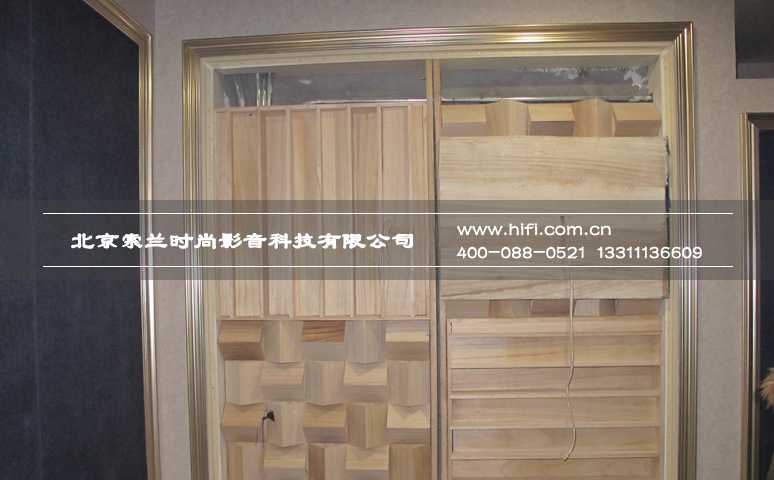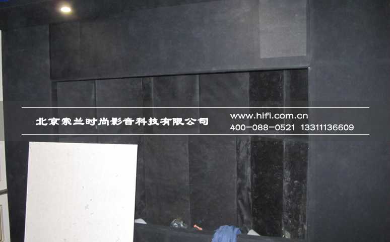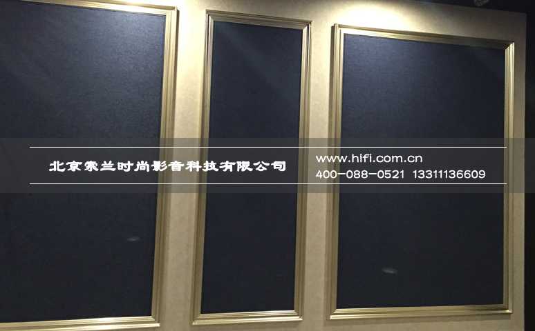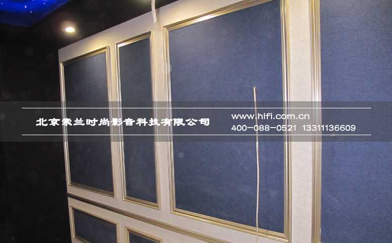 梯形结构的幕布墙构成了近1米的净深空腔,具有足够的放置落地式家庭影院音响的空间,墙面的处理以低频减震吸声块体,用以吸收音箱后区多余的反射波,使声音定位更加准确。