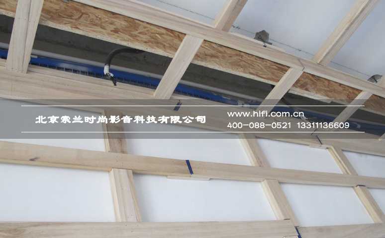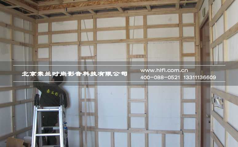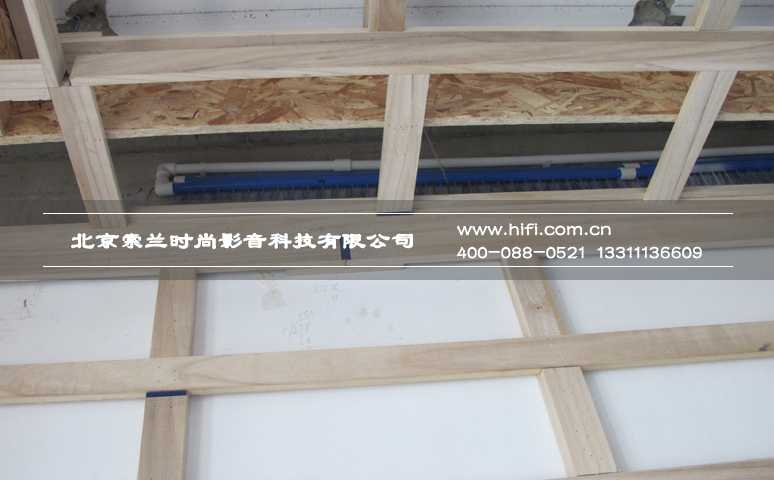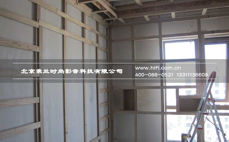 在上一次工程纪实中我们提到,望京•金茂府整个楼盘的房间都采用了温湿度独立控制的能源供应系统——毛细管网辐射系统,这种独特的系统使得房间内墙壁不能按常规家庭影院装修工艺进行施工。于是我们采用在管网系统外侧进行固定的石膏板做为底层墙体,施工辅料选用短枪钉的处理方法。