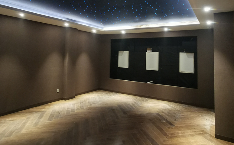 此次项目位于中粮瑞府别墅地下室,是兼顾影院与卡拉OK系统的多功能娱乐空间,工程从6月份底层进场到最后完工间隔半年多的时间,在春节前顺利完工。