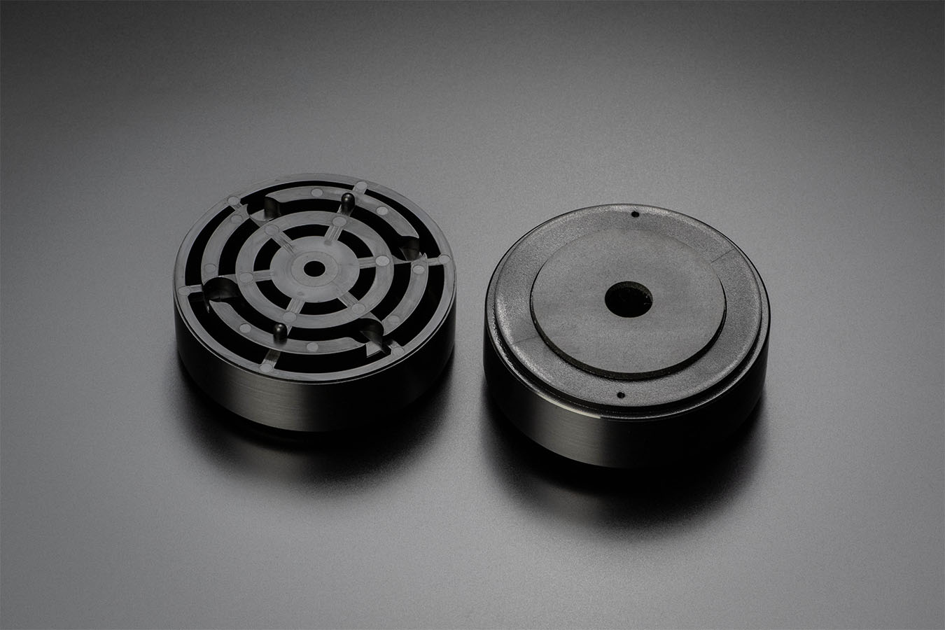 用于支撑电源变压器、散热器和机箱的重量的垫脚采用了高密度和高刚性的材料,除了进一步增强防震效果外,还实现了对音质有改善作用的机械接地效果。