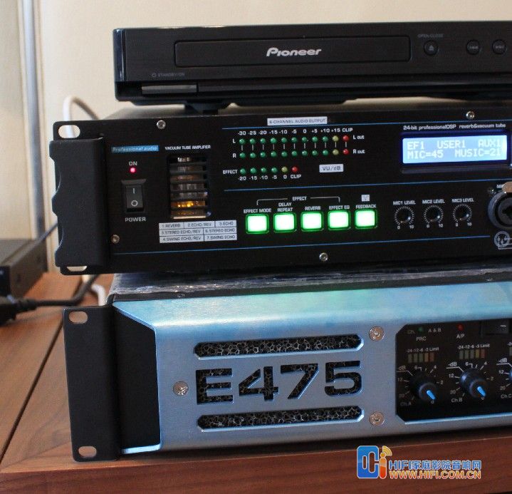 看到音响设备柜内的一个特别的设备,感到非常的惊异。原来是一直带有电子管的功放,段经理自豪的介绍:就是索兰影音万里挑一最终纳为己有的卡拉OK效果器,这效果器最大的特点就是“假”,因为它带有一只俄罗斯12AX7音乐型电子管作为激励单元。把它用在卡拉OK效果器上,音质上可以产生丰富的谐波,由于谐波的存在,所以失真度也很高,但正是由于这种失真才使声音变为格外的亮丽温柔,丝丝入扣。完全没有了一般卡拉OK功放前级产生的那种干硬。所以女声一唱像蔡琴,男声一唱像齐秦。而有谁愿意在卡拉OK的时候希望听到自己真实的声音呢?