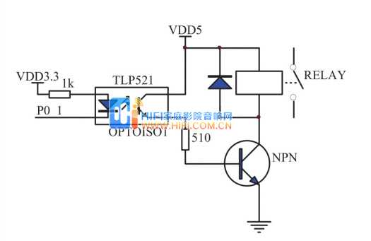 单路继电器模块电路图,当节点 CC2530主电路的射频模块接收到电机控制信号时,CC2530 的 I/O 口输出高低电 DAP 平驱动信号,经光电隔离器 TLP521将光电信号转为电信号,又经三极管放大,可控制继电器的吸合。窗帘到位后,行程开关自动关闭电机转动。在同一个时间内,两个继电器仅能有一个吸合,即便是在电机工作期间,操作了反向转动按键,单片机也是先释放当前工作继电器,并延时一定时间后再吸合另一个继电器,防止电机正、 反工作线圈同时通电的危险。
