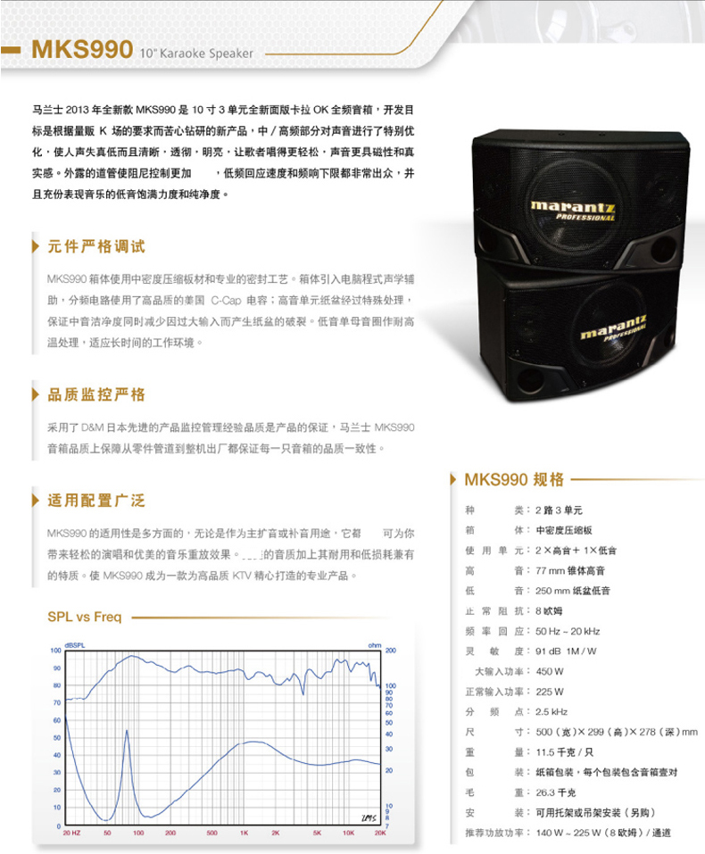 Marantz品牌有着悠久的历史。专注于生产专业的卡拉OK的音响设备包括民用和专业类别。在世界上获得一致好评,无论效果和品质都如他的金字标牌一样辉煌尽显。早在日本本土发源卡拉OK活动的时候,马兰士就已经凭借自身雄厚的技术力量和高素质获得市场的认可在继而推向世界。马兰士2013年推出全新版卡拉OK全频音箱,开发目的是根据量贩卡拉OK场所的要求而苦心钻研的新产品,中高频部分对声音进行了特别的设计对人生失真低而且清晰透彻明亮让歌者唱得更轻松声音更具有磁性和真实感,外露的管道促使阻尼控制更加饱满低频回应和频响下限都非常理想。并且充分表现音乐的力度和纯净度。原件严格调试。MK990使用中密度压缩板材和专业的密封工艺箱体引入电脑程序辅助分频电路使用了高品质的美国C-CAP电容,高音单元纸盆特殊处理保证中音洁净度的同时减少因过大输出而产生纸盆的碎裂,低音单元母线圈做耐高温处理适应长时间的工作环境。