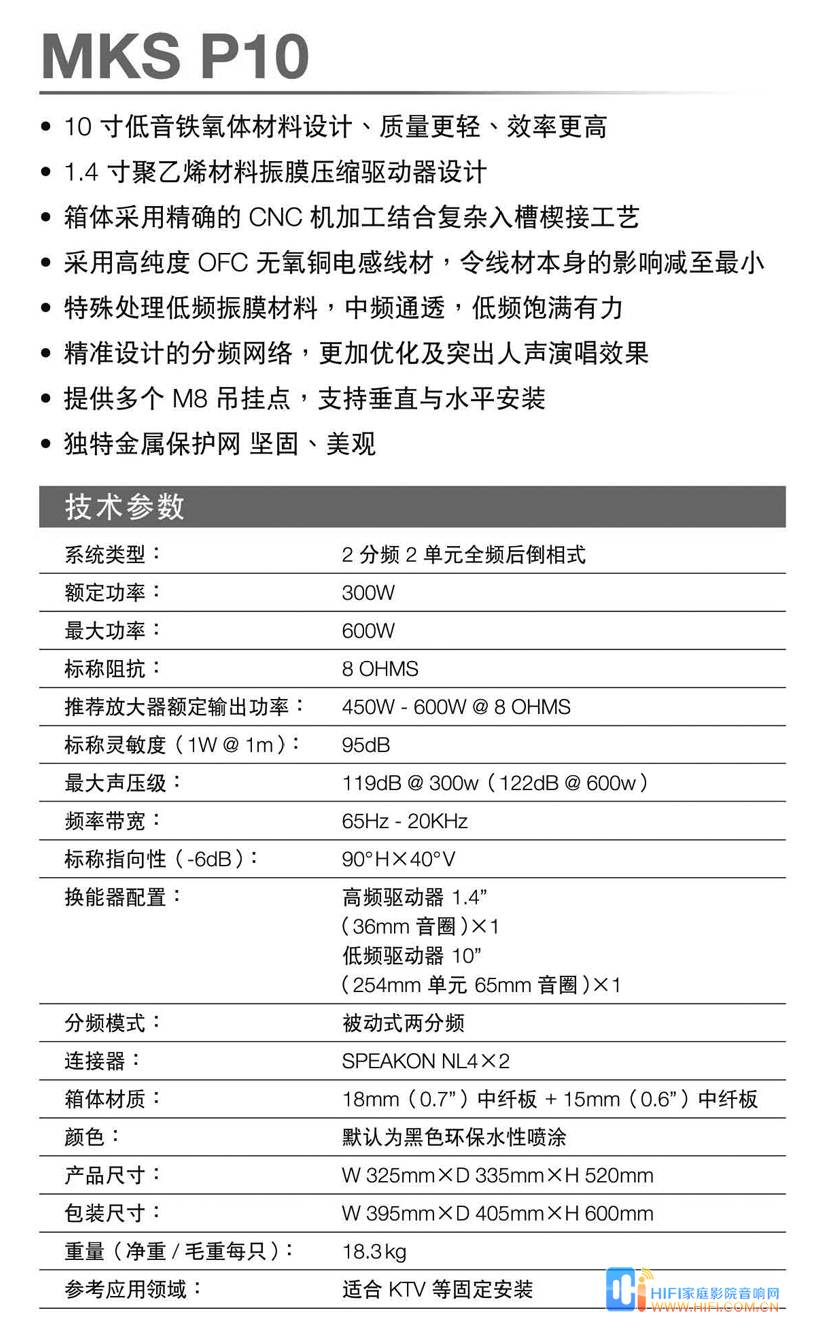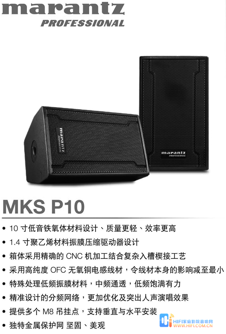 Marantz品牌有着悠久的历史。专注于生产专业的卡拉OK的音响设备包括民用和专业类别。在世界上获得一致好评,无论效果和品质都如他的金字标牌一样辉煌尽显。早在日本本土发源卡拉OK活动的时候,马兰士就已经凭借自身雄厚的技术力量和高素质获得市场的认可在继而推向世界。马兰士推出全新版卡拉OK全频音箱,开发目的是根据量贩卡拉OK场所的要求而苦心钻研的新产品,中高频部分对声音进行了特别的设计对人生失真低而且清晰透彻明亮让歌者唱得更轻松声音更具有磁性和真实感,外露的管道促使阻尼控制更加饱满低频回应和频响下限都非常理想。并且充分表现音乐的力度和纯净度。原件严格调试。P10使用中密度压缩板材和专业的密封工艺箱体引入电脑程序辅助分频电路使用了高品质的美国C-CAP电容,高音单元纸盆特殊处理保证中音洁净度的同时减少因过大输出而产生纸盆的碎裂,低音单元母线圈做耐高温处理适应长时间的工作环境。