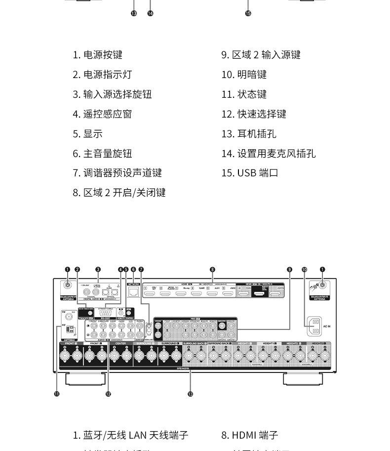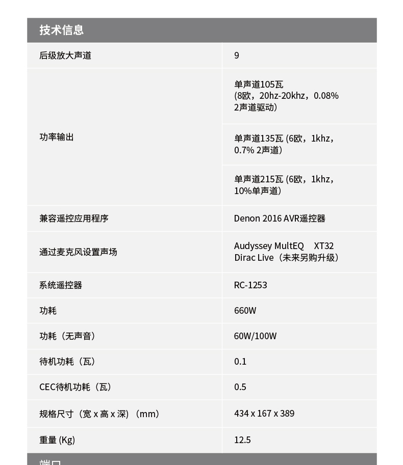 连接端口 HDMI6进3出(其中6进2出支持8K)光纤、同轴、模拟音频等,4低音炮输出