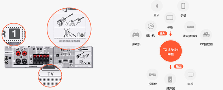 TX-SR494另一个新增的绝佳功能是Zone B前级/线路输出。它可以把连接到接收机的不同音源(包括HDMI和数字音频)输送至带有RCA模拟线路输入的其他设备。将音乐分享到家中其他空间的高保真音响,或者无线耳机发射底座,而你仅需享受娱乐,不会打扰到任何人。