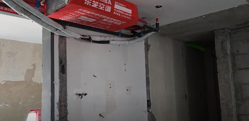 在屏幕的位置左侧做一个隐形门,在这个墙面上,往前做出一个15公分的透声墙结构,隐藏影院的音箱,同时挂幕布。门的这一侧就正常处理,但是在门的上方有一个空调的风机,采用的是侧出下回的结构,在精确的把握边调顶的宽度和下垂的高度之外。