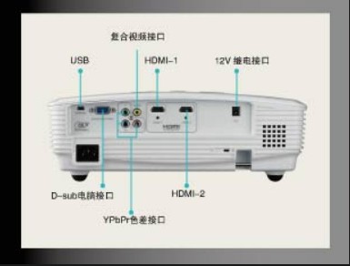 2组HDMI、色差输入、D-sub电脑输入、复合视频输入、+12V继电器控制输入等接口,满足各种输入源的播放需求。