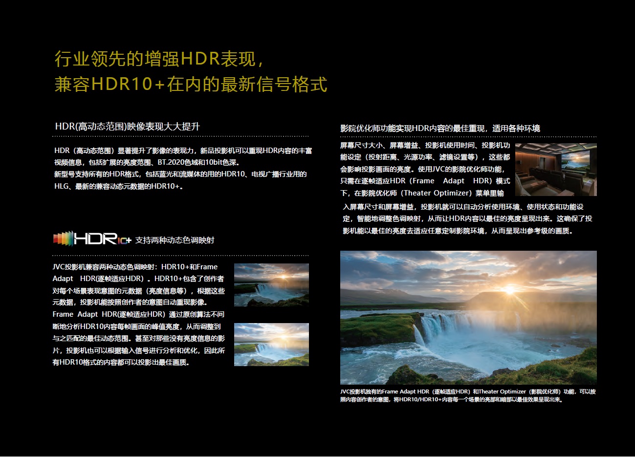 行业最领先逐帧适应HDR(Frame Adapt HDR)技术,HDR10+技术,呈现高动态范围画质,充分表现电影层次及明暗对比;