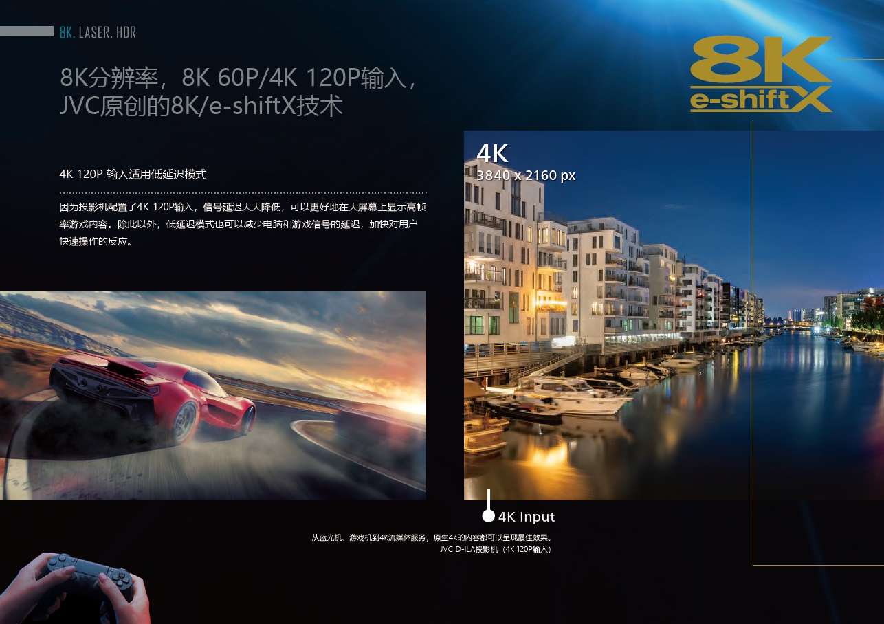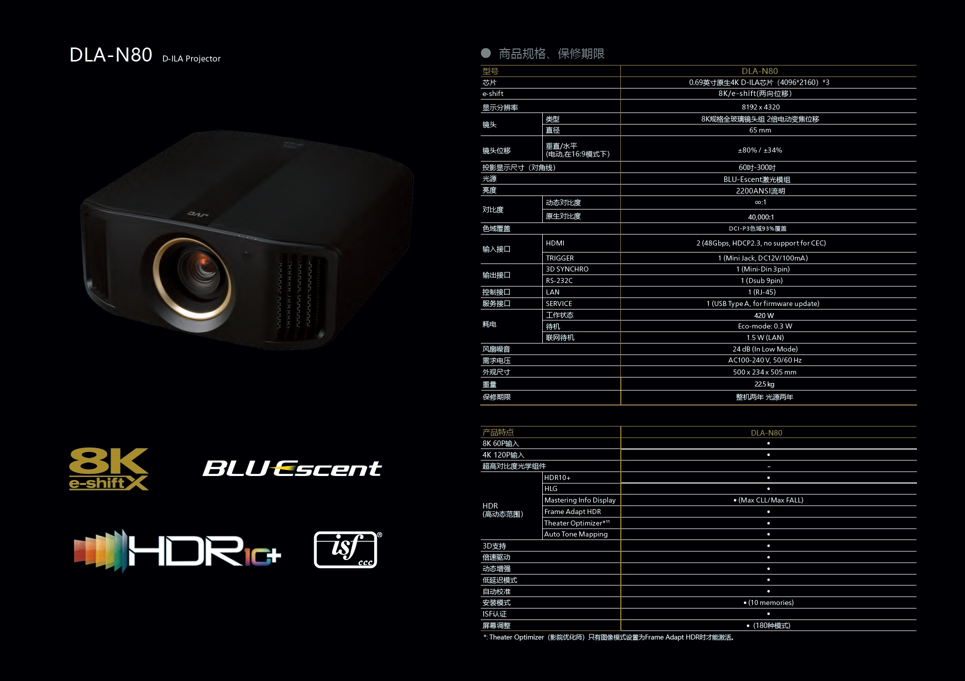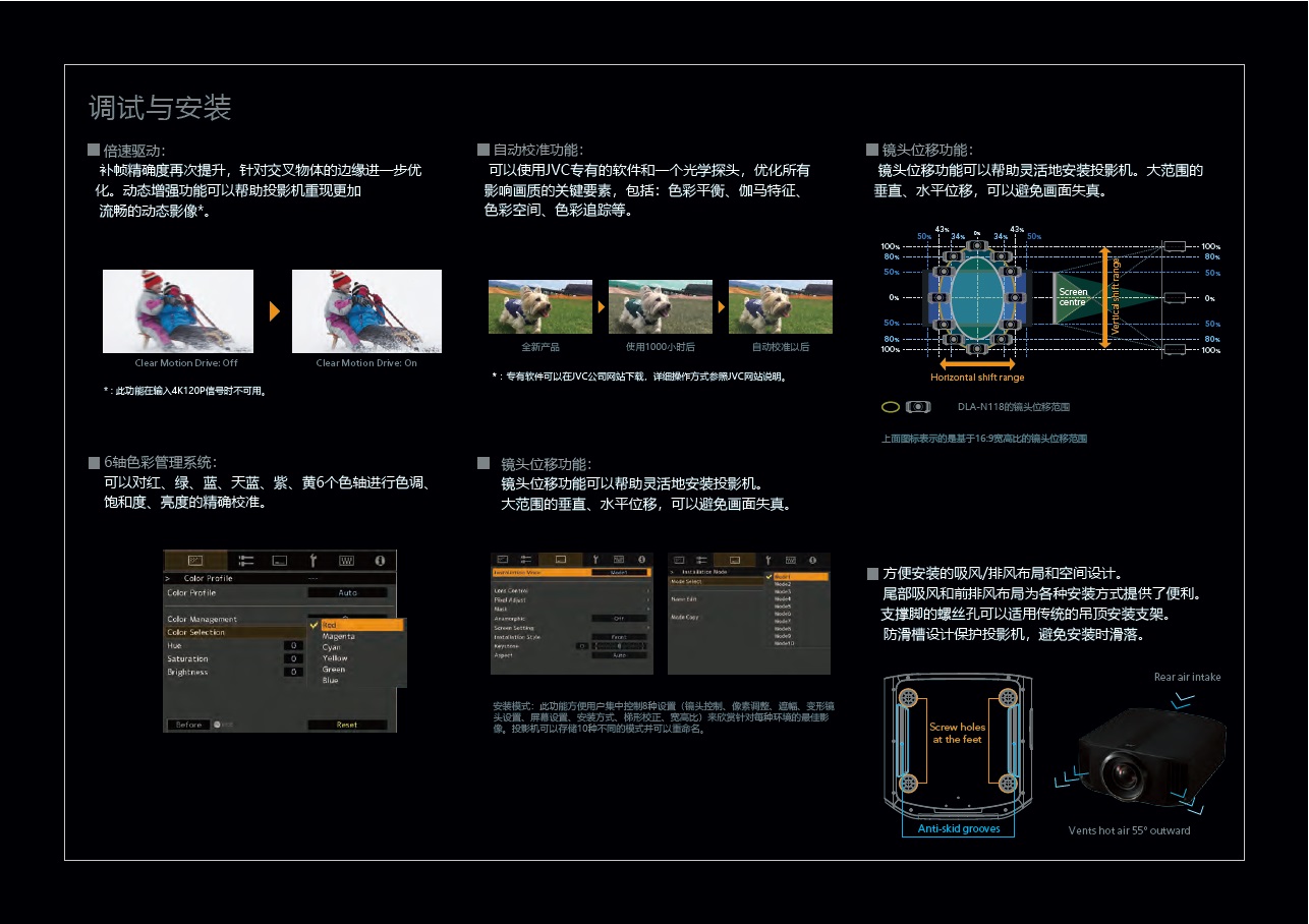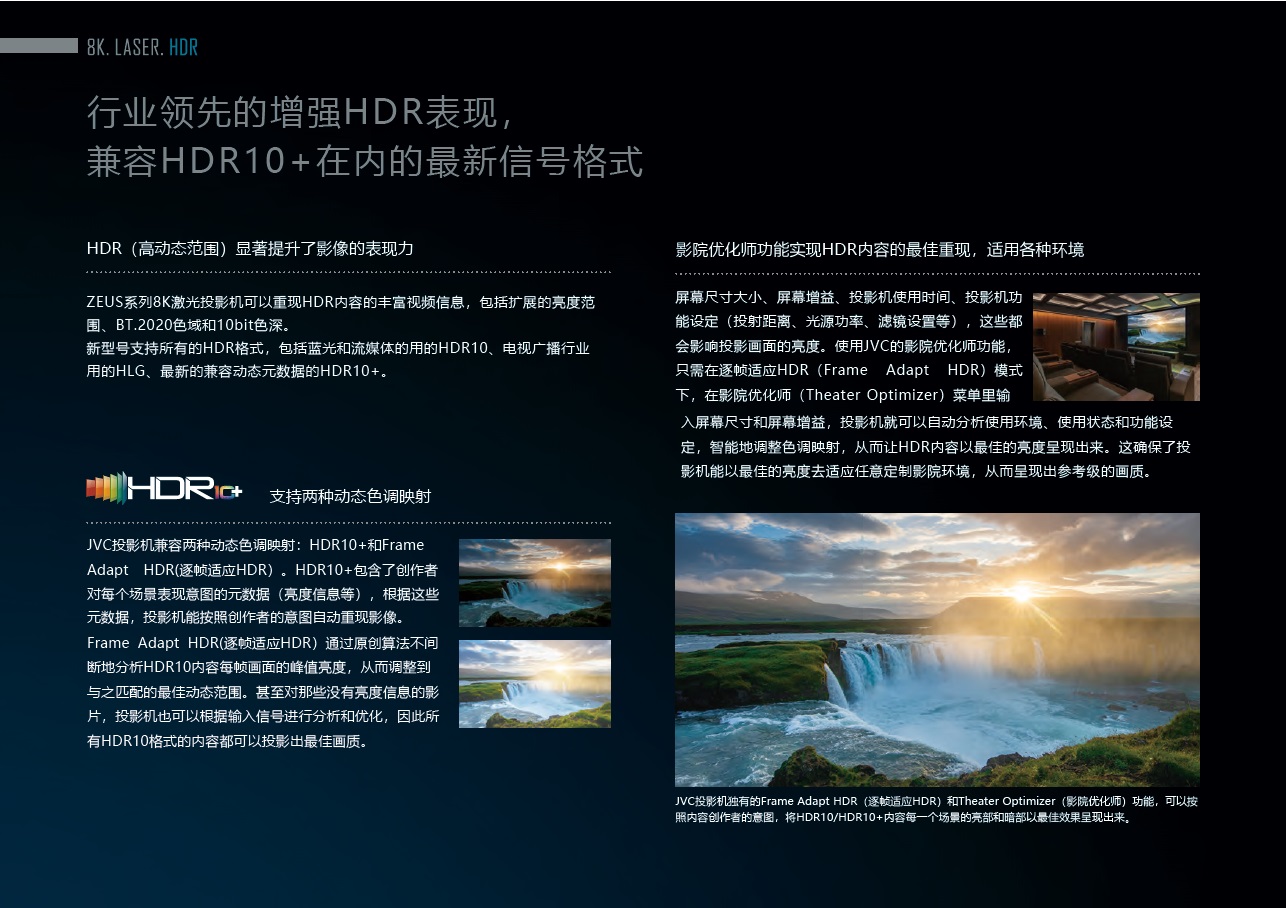搭载JVC独有的Frame Adapt HDR(逐帧适应HDR)和Theater Optimizer(屏幕优化师),这两个独有的功能提供最好的HDR图像;