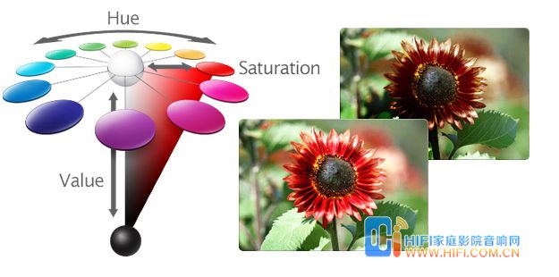6 种主要颜色采用独立 3D 色彩控制这套色彩管理工具可让您独立细调六种主要颜色(红、绿、蓝、青、品红、黄)的增益、饱和度和色调。 |
