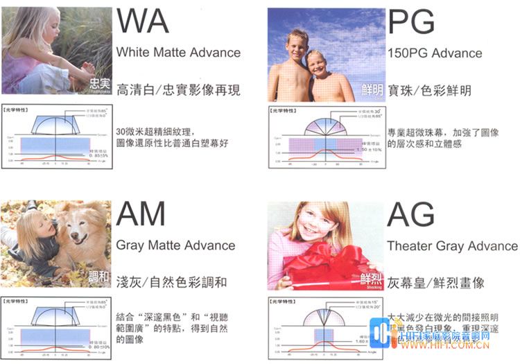 漫散射幕:柔和的图像,超宽广的视听范围,需考虑外部光线,杂乱光线的影响(新型灰塑幕受外部光线,杂乱光线的影响小)。分为AM(浅灰):可在客厅使用/适应于电影放映/黑色层次和自然肤色。WA(高清白):柔和的图像/常规银幕。