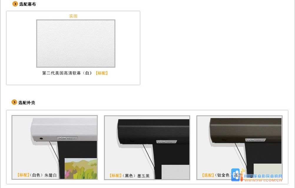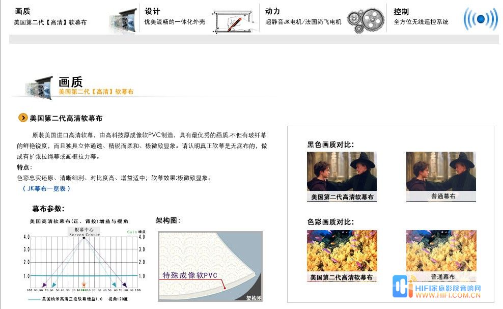 第二代美国高清软幕布+第二代铂铝合金外壳+JK国际静音电机+JK内置多功能遥控系统