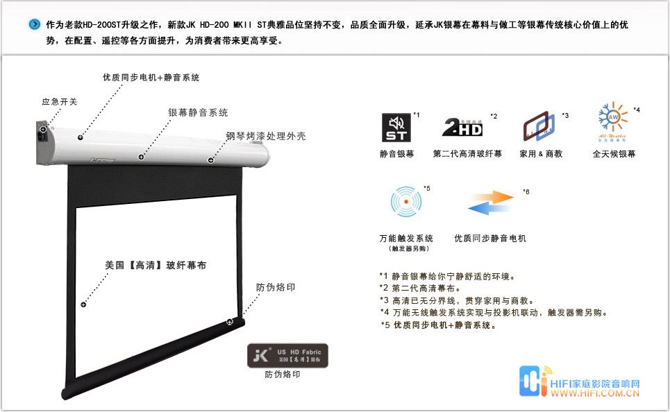 经科JK电动高清玻纤幕HD-200 MKII ST(第二代美国【高清】玻纤幕布+钢琴漆弧形彩钢外壳+同步电机 参考价格如下:此价格不包含遥控器