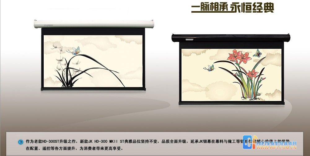 经科JK电动高清玻纤幕HD-300 MKII ST(第二代美国【高清】玻纤幕布+钢琴漆弧形彩钢外壳+同步电机+三角底管)